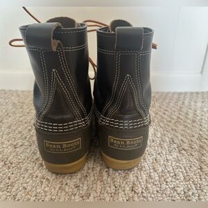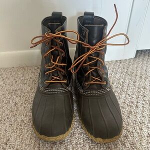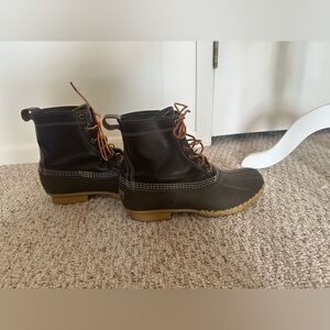 Good condition size 10M L.L. Bean boots feature a durable black leather upper and a waterproof brown rubber bottom, ideal for wet and snowy conditions. The classic lace-up design ensures a secure fit, while the textured sole offers excellent grip on slippery surfaces. Perfect for outdoor adventures, these boots blend functionality with timeless style.