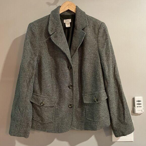 LL Bean Blazer Galway Jacket Herringbone Wool Silk Wool Blend Button Up Large