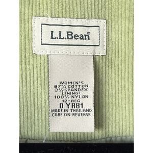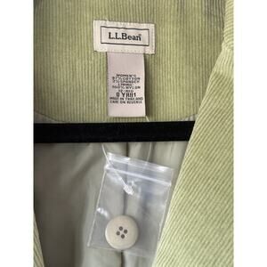 This L.L. Bean blazer jacket is a vintage piece in a size 12P, designed in a green corduroy fabric with a classic equestrian academia style. The jacket features a solid pattern, long sleeves, a short length, and a button closure.