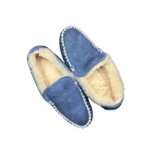 Cozy blue suede moccasin slippers with a soft lining. These shoes are in fabulous condition! Interior is spotless, lining is fluffy and bottoms are nearly new. Measures at a 9.5/10. 9.5 comfortably. Coming from a smoke free, pet free environment. Properly sealed and shipped.