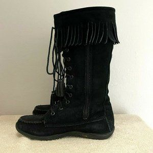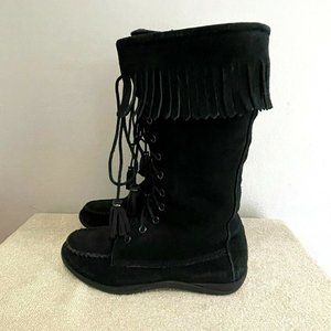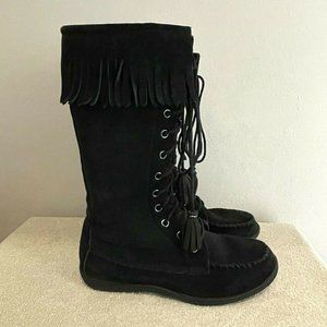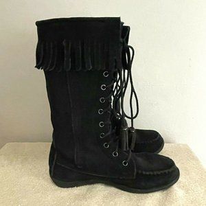 L.L. Bean Boots 6 Black Suede Side Zip Lace Up Front Fringe Trim Moccasin Tall