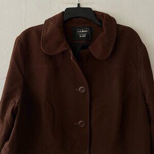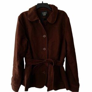 L.L. Bean Cumberland Barn Jacket. Rounded collar. Button closure. Slip pockets. Removable belt. Lined.