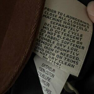 100% cotton outer shell. Fabric is a heavy cotton with a brushed finish. Machine washable.
