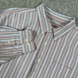 This is an L.L. Bean men's button-down dress shirt in size 2XL. The shirt features a red and blue striped pattern with a collared neckline and long sleeves. Made from cotton knit fabric, this shirt is machine washable and ideal for winter, fall, and spring seasons. The closure is buttoned, and the collar style is button-down, giving a classic and stylish look suitable for casual wear.