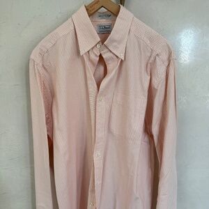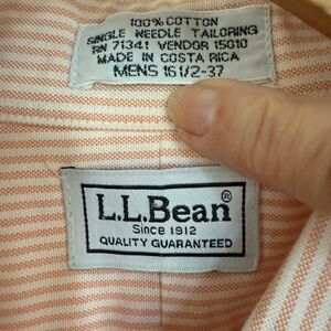 LL Bean men's 100% cotton classic button down shirt in an orangey pink and white stripe. Size 16.5-37