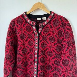 LL Bean Cardigan Sweater Red Snowflake Fair Isle Merino Lambswool 100% Wool Vintage Large