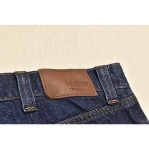 These classic L.L. Bean jeans are designed for comfort and durability. The pair features a timeless, dark blue denim wash that's easy to pair with a variety of tops. They have a classic fit, providing a relaxed feel through the waist, hip, and leg. The pants are made from 100% cotton, ensuring they are breathable and comfortable for all-day wear. The five-pocket design, along with a zip fly and button closure, offers practical functionality. These jeans are a reliable staple for any casual occasion. Please refer to the photos for detailed measurements, as they are a Big & Tall size 42x32, and to see the overall excellent pre-owned condition.