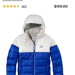 Stay warm with this stylish L.L. Bean puffer jacket. Features a cozy hood and colorblock design. Perfect for cold weather.