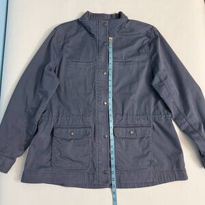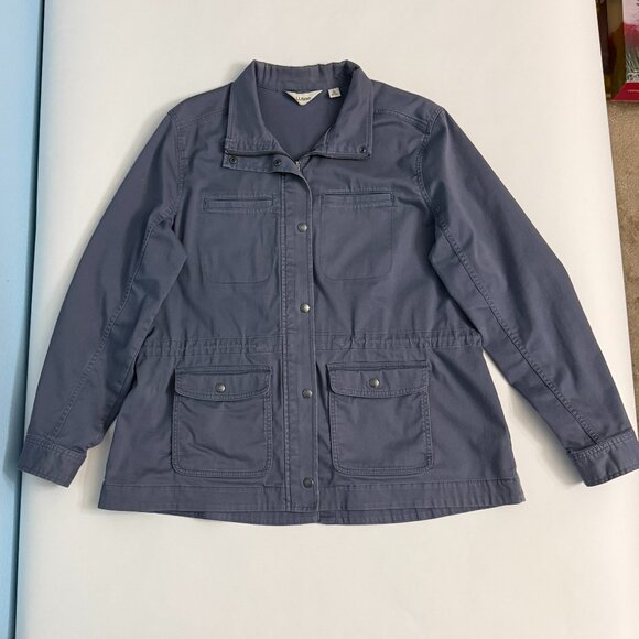 This stylish LL Bean jacket is the perfect outerwear for women in size XL. Made of durable cotton canvas in a solid blue-gray color, this mid-length jacket features long sleeves, full zip closure, snap buttons and an optional interior toggle at the waist. With four pockets for convenience, this jacket is machine washable and designed for comfort. Perfect for everyday wear, this LL Bean jacket combines functionality with a classic style that is sure to become a staple in any woman's wardrobe.