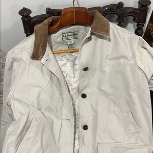 Stylish trench coat by L.L. Bean. Cream body with a contrasting brown collar. Features button closure and front pockets. Barn coat with flannel insides printed with ducks, dear, trout and others.