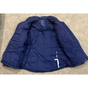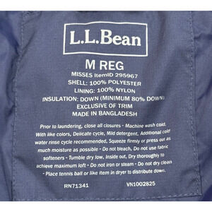 The LL Bean Down Puffer Jacket is a classic and stylish outerwear piece perfect for women's size M. This navy blue jacket features a durable polyester outer shell with a softshell fabric type, making it both water-resistant and wind-resistant. The mid-length coat is insulated with down and lined with cozy down material, providing warmth during the winter, fall, and spring seasons. With features such as zipped pockets, quilted design, and a full zip closure, this jacket is ideal for travel and casual occasions, showcasing both functionality and style with the iconic L.L. Bean brand. One tiny patch on a pinhole. See last photo. Not visible unless you look for it up close.