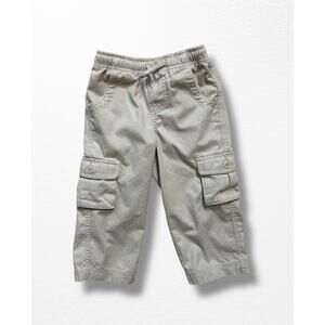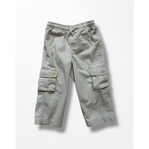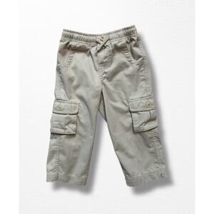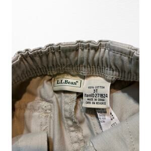 Light khaki drawstring cargo pants from LL Bean in kids’ size 3T. Elastic waist with drawstring, faux fly with button, side, back, and cargo pockets. Back and cargo pockets have button closures. 100% cotton, in gently pre-loved condition, no stains or tears.