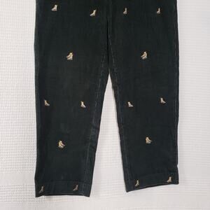 Green L.L. Bean Duck Boot Corduroy Pants. These L.L. Bean men's forest green, flat-front, classic fit, straight leg corduroy chino pants feature an all-over embroidered Duck Boot design and a zip-fly closure.