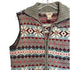 L.L. Bean Fair Isle Vest Womens Large Gray Multicolor Lambs Wool Full Zip Nordic