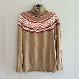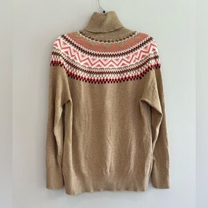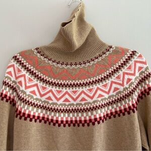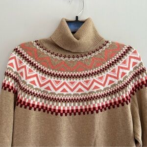 LL Bean Fair Isle Yolk Turtleneck Cotton Cashmere Sweater Tan and Coral, S