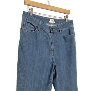 The favorite fit straight leg jeans by L.L. Bean. Classic style and comfortable fit. Zip fly. Button closure. 5 pocket styling. True blue Medium wash. Machine washable cotton blend with spandex for stretchiness. Excellent condition. Size 10. See photos for exact unstretched measurements.