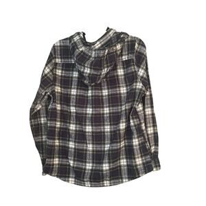 LL Bean Flannel Shirt Womens M Green Scotch Plaid Relaxed Fit Zip Hoodie Pockets