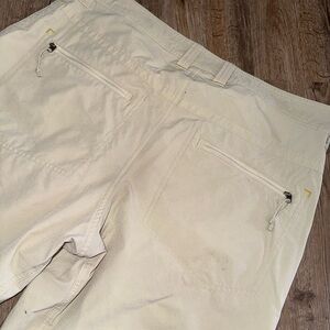 In great shape with a few minor blemishes (pictured). Size and material tag have been removed but they measure to be a 36 waist and feel like they’re made of a water repellent type material - like quick dry.