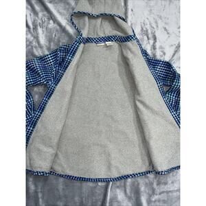 This is an LL Bean fleece-lined flannel hoodie for kids in size M (10-12). It features a blue plaid pattern with a fleece lining for added warmth. The hoodie has a button-up style and a colorful theme, making it suitable for the cold season. It is designed as unisex kids' clothing with a comfortable and stylish lined design.