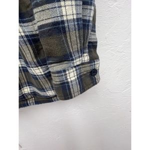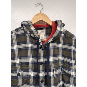 LL Bean Fleece Lined Flannel Shirt Jacket Size L Blue Grey Orange Cotton Hoodie