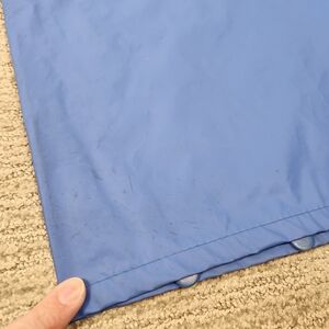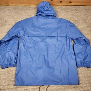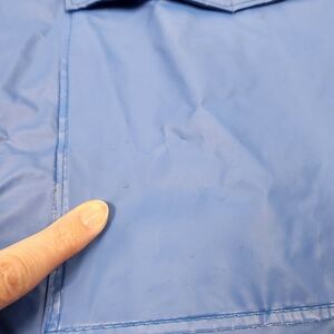 Mens Large L.L. Bean matching blue rain suit. A few dirty spots and marks, one tiny seam crack in crotch, see photos. Nothing that affects the use.