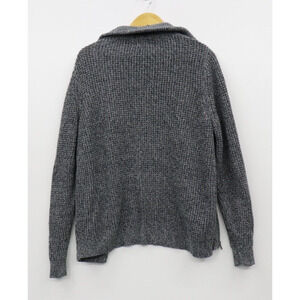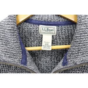 This is an L.L. Bean men's sweater in size medium, featuring a waffle-knit design. The sweater is made of 100% organic cotton in grey and blue colors. It has a mock neck and a full zip closure. The style is classic and preppy, suitable for outdoor activities like walking and hiking. Size M Pit to Pit 22" Sleeve Length 27" Overall Length 26" The color is a Grey with a blue undertone, Has Navy blue trim. SKUJ46