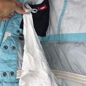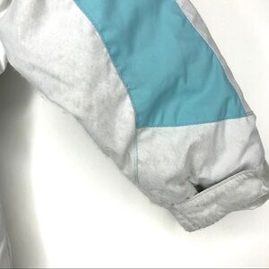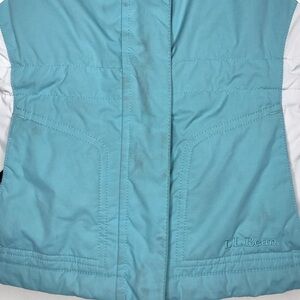 LL Bean Girl's Snow Ski Hood Zip Up Jacket Reflective Size 4, left sleeve is quite roughed up and snagged. The jacket is still wearable and nice and heavy duty - the sleeve could probably be fixed with a lint shaver.