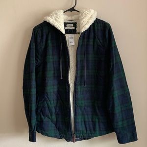 Cozy plaid jacket with hood. Features green and blue pattern. Soft inner lining for warmth.