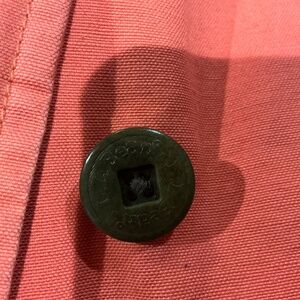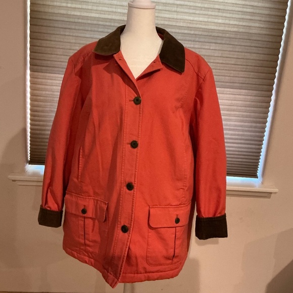 Jacket in very good condition. Heavy coral/salmon colored canvas with Thinsulate insulation to include arms. 2 upper large slanted pockets, 2 lower button pockets, corduroy collar, cuffs. Extra buttons sewn in for loss. Has been cleaned and comes from nonsmoking home. Price is firm and no bundling as weighs 4 lbs. Great for very cold climates.