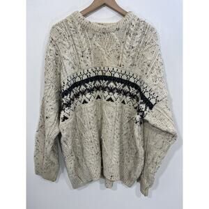 LL Bean Irish Wool Fair Isle Grandpa Heritage Sweater L Cabincore Fisherman Aran Style Cable Knit Beige.