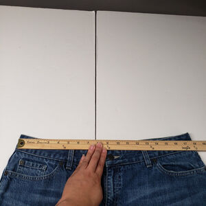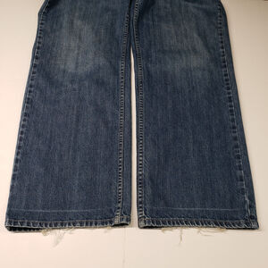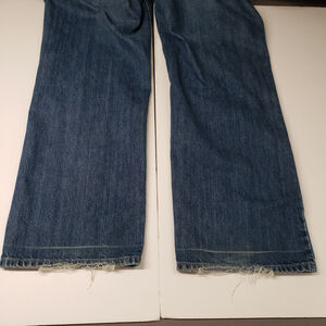 Pre-owned and in good condition! The jeans have a crease from the hem being let out. There is heel drag damage on the back of each bottom hem.
