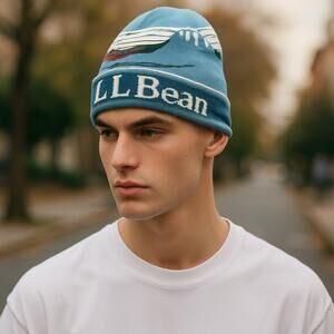 LL Bean Katahdin Beanie Hat Cuffed Adult Skull Skullie Skyline Retro Green Blue Mountain Ski Snow