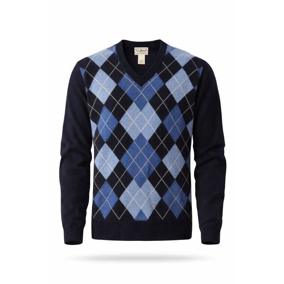 Classic L.L. Bean argyle sweater featuring a blue and black diamond pattern with a V-neckline. Made from 100% lambswool for warmth and durability. Timeless preppy style that works well for casual wear, office layering, or fall and winter outfits.