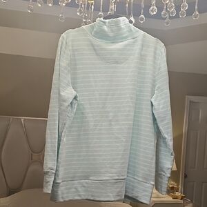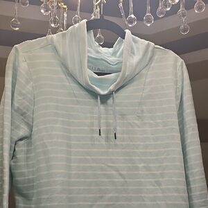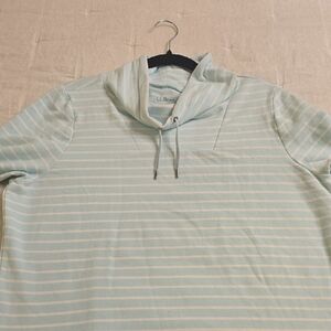 Cozy light blue hoodie with subtle stripes. Features a drawstring hood and long sleeves. Perfect for casual wear. Very stretchy. Can fit normal large or XL.