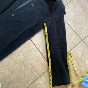 Long black (like wool - its not wool) coat. Very long, with a flowy quality to the bottom I'm 5'6 and it's about mid to low calf/ankle on me. Size Medium but fits like in between a small and medium.