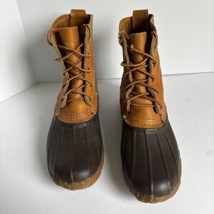 These vintage LL Bean Maine Hunting Shoe Duck Boots are a size 8 in brown leather and rubber with a round toe, lace-up closure, and low block heel. They feature lace and eyelet accents, are made in the USA , and are suitable for outdoor activities. The boots are waterproof, comfortable, and water-resistant, with a rubber outsole and leather lining.