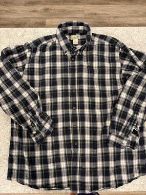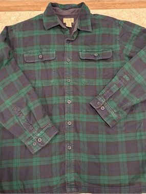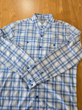 LL Bean fleece lined flannel shirt in a classic blue and white plaid pattern. Crafted with a soft 100% cotton shell and a cozy polyester fleece interior, this long-sleeve button-down provides exceptional warmth for cooler weather. The design features a single chest pocket, buttoned cuffs, and a traditional collar, making it a versatile piece for outdoor activities or casual everyday wear. The durable construction and timeless aesthetic ensure this shirt-jacket remains a cold-weather staple for years to come.