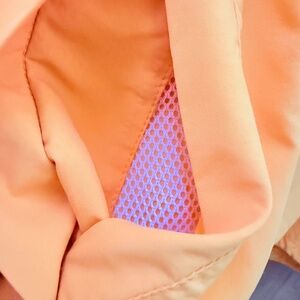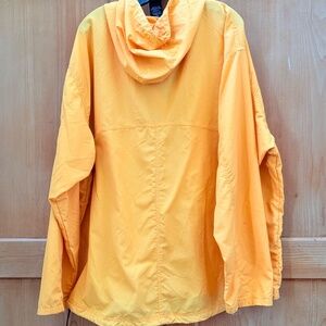 Nylon water-resistant windbreaker from LL Bean. Features half-zip, cinchable hoodie, and Kangaroo style mesh-backed front pocket. Back is slightly longer than front (cycling style), and hem has integrated drawstring to secure against "updrafts"