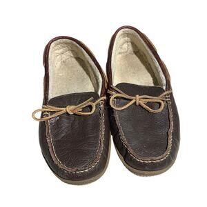L.L. Bean men’s leather moccasin-style slippers in medium brown, size 11. These cozy slippers feature a genuine leather upper with soft fuzzy lining for warmth and comfort. Designed with a classic moc-toe and rawhide laces, they offer both style and relaxation for indoor wear.