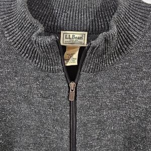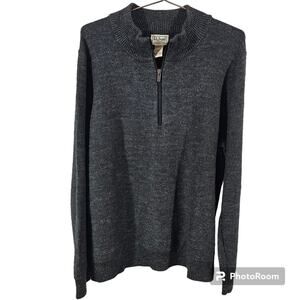 This quarter-zip organic cotton sweater in a heathered black/gray color from L.L. Bean is in like new condition, or EUC. It has a subtle texture and a highly versatile weight. Its casual styling is great with jeans, cords, or khakis. It has a relaxed fit through the chest, sleeve, and waist. Machine wash; dry flat. Men's Size Large.