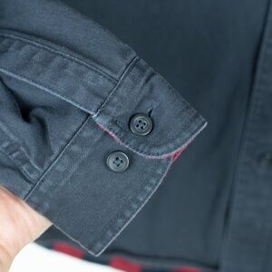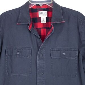 Classic L.L. Bean quality and comfort. This Traditional Fit flannel-lined shirt jacket (Item 298205) features a sturdy charcoal Navy Blue 100% cotton shell and a soft red-and-black buffalo check cotton flannel lining. Style resembles the sought-after “Hurricane” shirt style — rugged yet comfortable, perfect for layering through fall and winter.