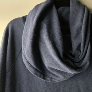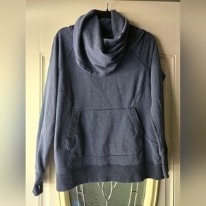 Cozy and stylish navy blue sweater. Features a comfortable cowl neck and kangaroo pouch front pocket. Perfect for casual wear.