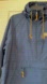 L.L. Bean classic Navy anorak jacket, pullover with hoodie, half zipper closure, lightweight. Features a front zip pocket and adjustable hood with gold drawstrings and leather details. Great preowned condition gently used no flaws.