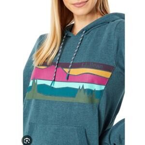 Excellent preowned condition L.L. Bean Womens Multicolor Mountain Skyline Cotton Blend Graphic Hoodie Size Xs. Cozy hoodie with vibrant graphic design. Features drawstring hood and front pocket. Ideal for casual wear.