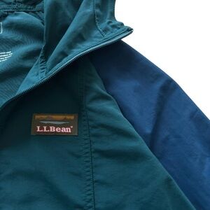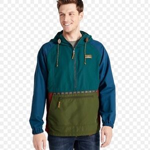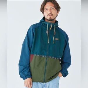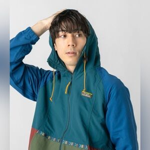 Vibrant utility jacket with hood. Features blue, green, and brown panels. Ideal for casual wear.