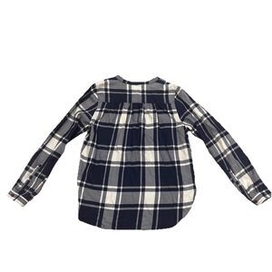 The LL Bean Navy Plaid Quarter Button Pullover Blouse is a classic and versatile lightweight flannel shirt perfect for everyday wear. Made by the trusted brand L.L. Bean, this blouse features a comfortable round neck and casual long sleeves. The blue plaid pattern and button accents add a touch of style to this wardrobe staple, making it a great addition for outdoor or outdoor-inspired outfits. With a size small and regular fit, this blouse is a timeless piece for any woman's collection.