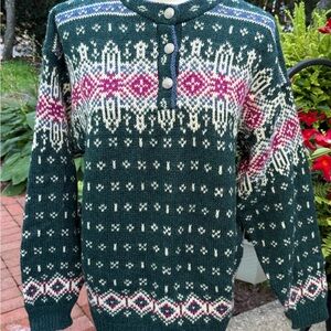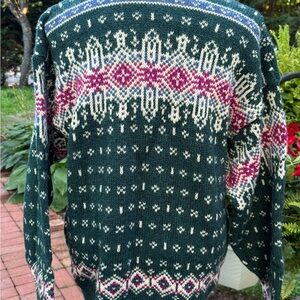 L.L. Bean Nordic Wool Crewneck Sweater - Green and Pink Pattern Fairisle