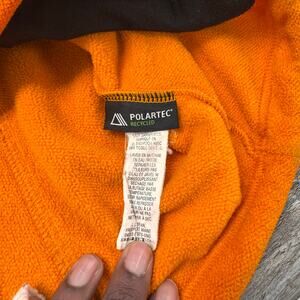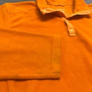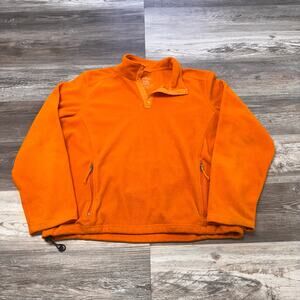 LL Bean Orange Men XL Regular Zipper Pocket Quarter Snap Fleece Polartec Jacket Sweater Sweatshirt Fleece Sweater In good pre-owned condition, mock neck pullover cuffed snap zipper pocket straight hem polyester pullover. classic camping hiking preppy outdoorsy made in Taiwan