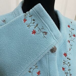 This L.L. Bean cardigan sweater for women features a floral embroidered design on a cozy Polartec fleece fabric. The sweater has a crew neck, long sleeves, and a button closure. It is in a classic fit with a size small. The material is a blend of polyester and spandex, making it lightweight and stretchy. This vintage-inspired sweater is perfect for travel, casual outings, or workwear during the fall, winter, or spring seasons. It is in excellent preowned condition. #LLBean #Cardigan #Polartech #Fleece #Embroidery