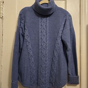 Cozy periwinkle cable knit sweater by L.L. Bean. Turtleneck style with scooped hemline and rollable cuffs. Perfect for layering.